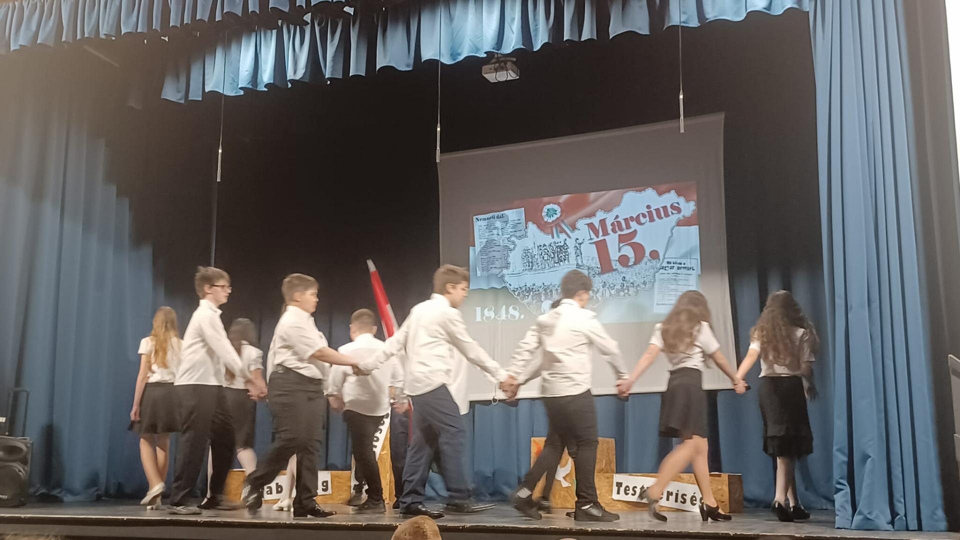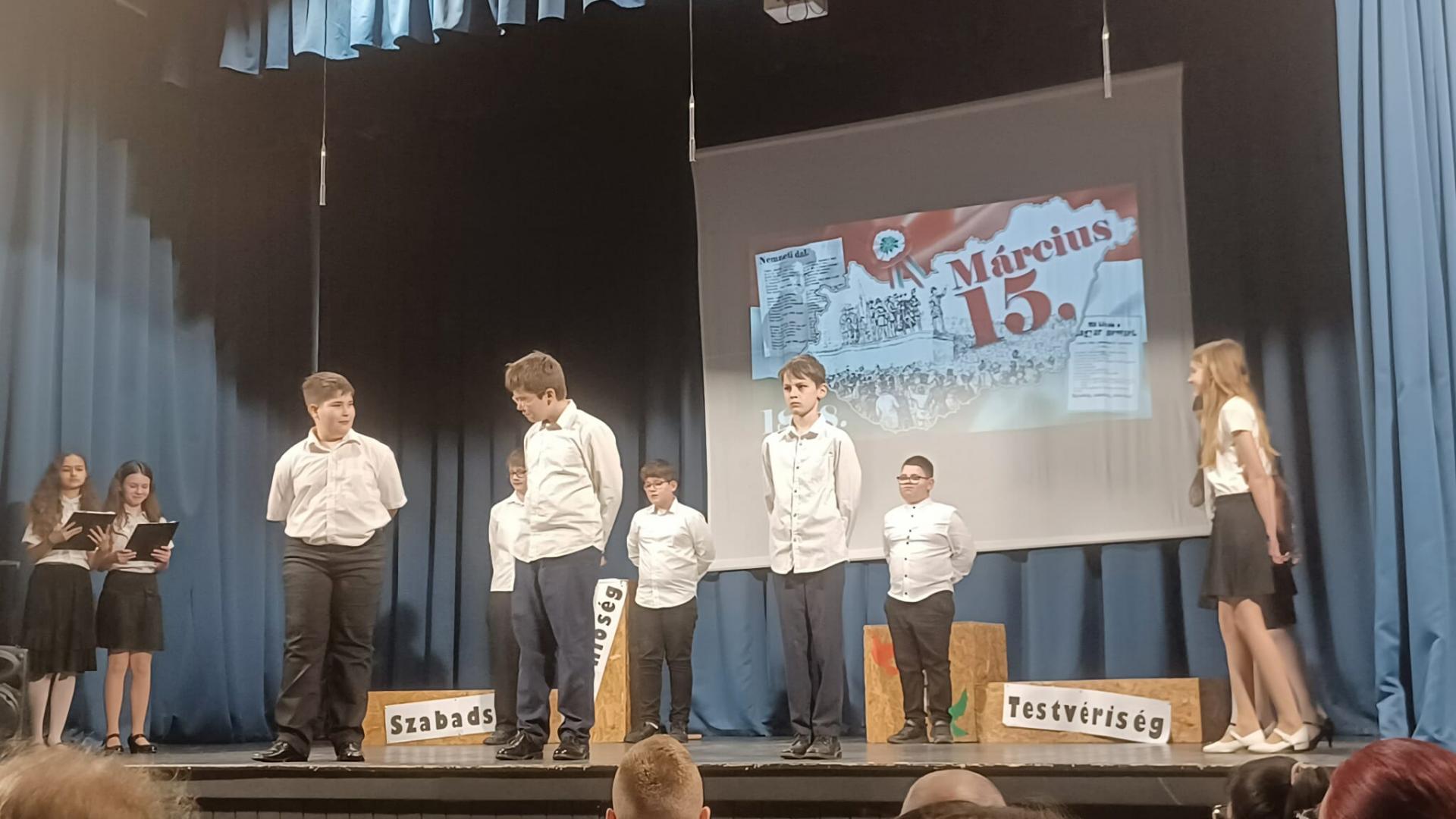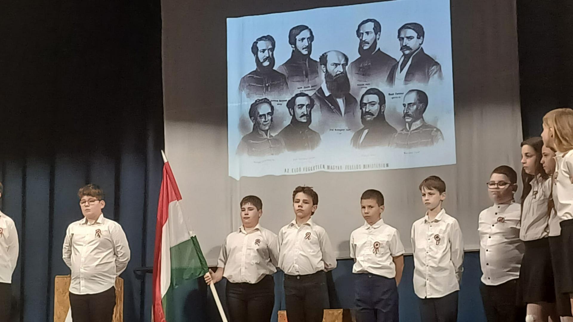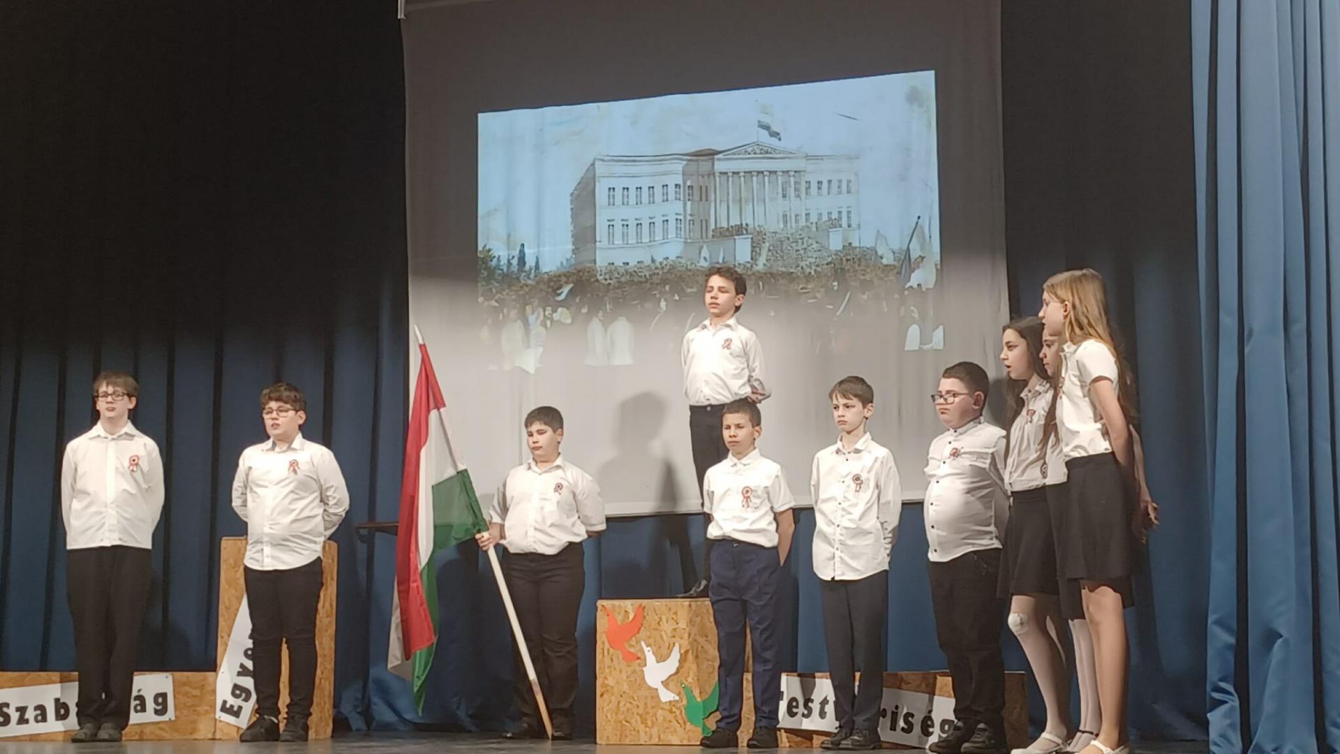 Az 5. osztályosok műsorában elhangzott versek és dalok felidézték a kor hangulatát, utaltak az akkori európai forradalmi eseményekre és bemutatták, mi történt hazánkban ezen a történelmi jelentőségű napon.
