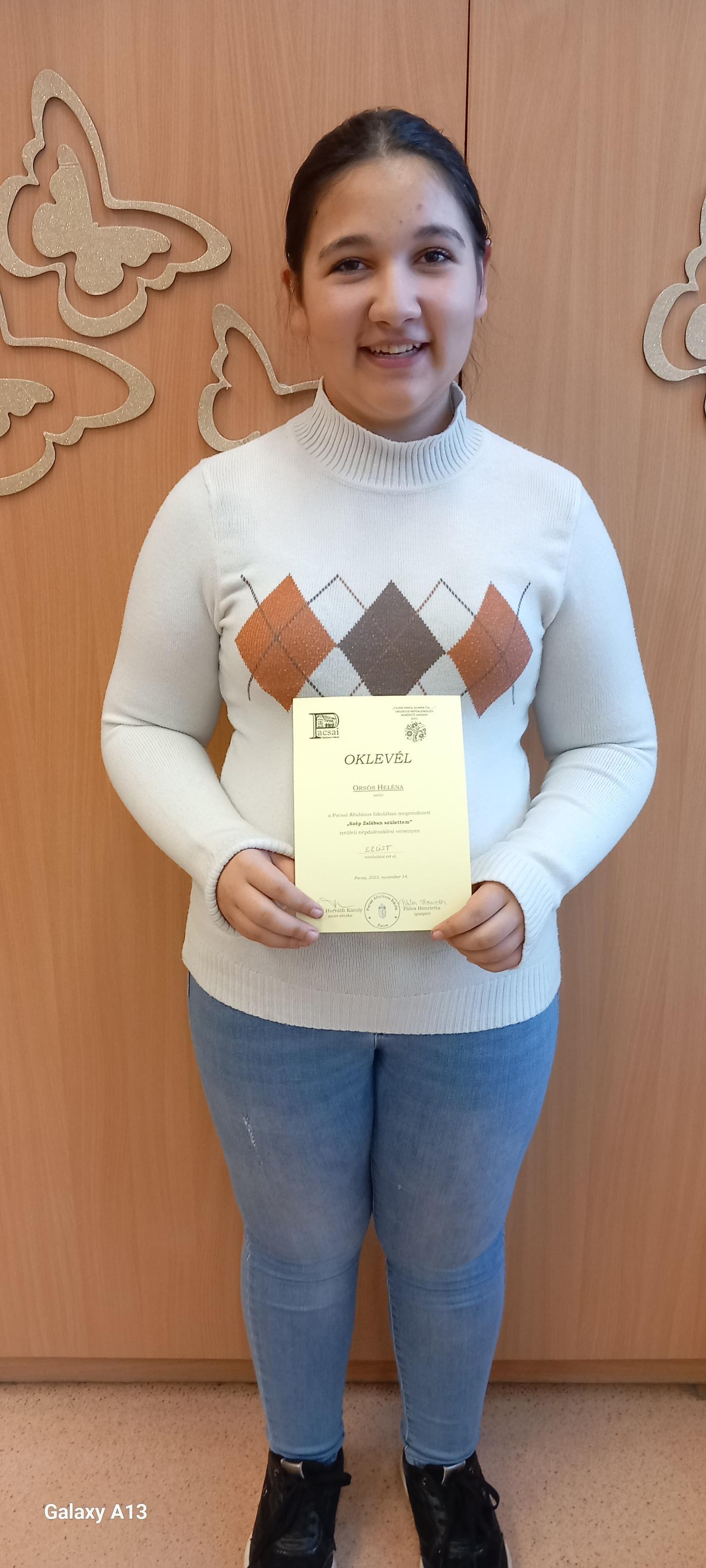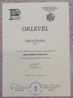 A „Tiszán innen – Dunán túl” népdaléneklési minősítő verseny Zala vármegyei területi fordulóján szóló kategóriában indult Orsós Heléna, 7. osztályos tanulónk. Teljesítményéért ezüst minősítést kapott. Felkészítő pedagógusa Galuska Sándor tanár úr.