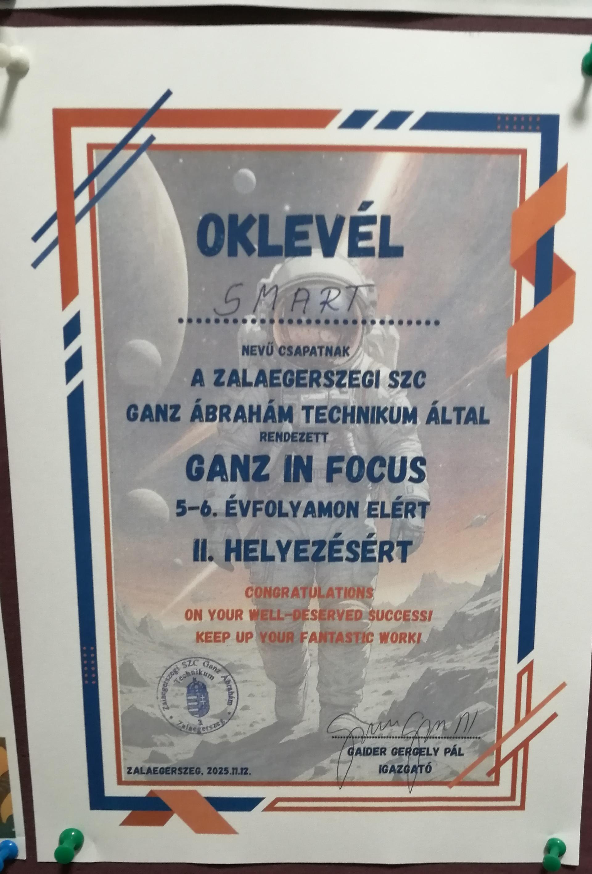 Az 5. osztályból három tanuló – Hetesi Mihály, Tasner Noel és Varga Mátyás – a zalaegerszegi Ganz Ábrahám Technikum által szervezett „Ganz in Focus” angol nyelvű országismereti vetélkedőn vett részt. A csapat a Space Exploration (űrkutatás) témaköréhez kapcsolódó feladatokat oldott meg a 2025. november 5-én tartott versenyen, ahol 2. helyezést értek el.