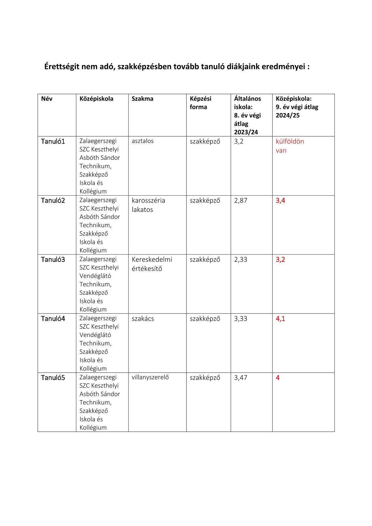 A középiskolák megküldték számunkra, hogy hogyan teljesítettek a tőlünk elballagott nyolcadikos diákok a 9. évfolyamon. Óriási büszkeséggel tölt el bennünk, hogy diákjaink megállják a helyüket mind az érettségit adó, mind a szakképző iskolákban. Egyetlen egy olyan diákunk sincs, aki jelentősen gyengébben teljesített volna, mint nálunk.